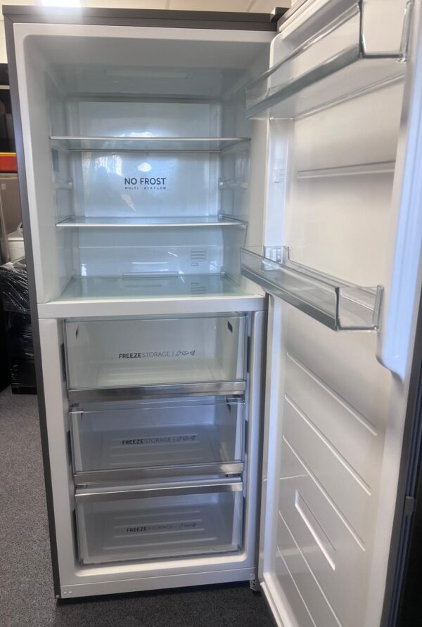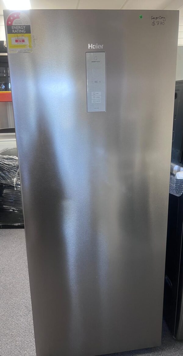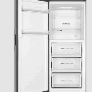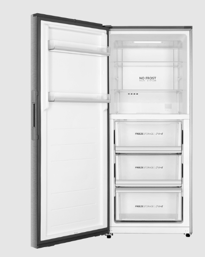 Features: Upright frost-free freezer design, eco-friendly R600a refrigerant, external LED display control, holiday mode, super freeze function, 3 freezer drawers, manual twist ice maker with bin, LED lighting, reversible door, and door alarm