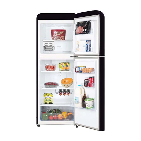 The refrigerator features a sleek retro black finish with curved edges, adding a stylish touch to any space.