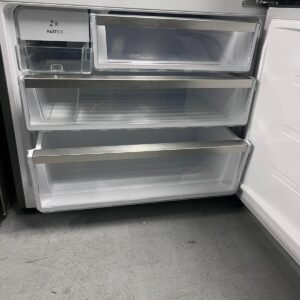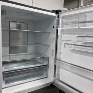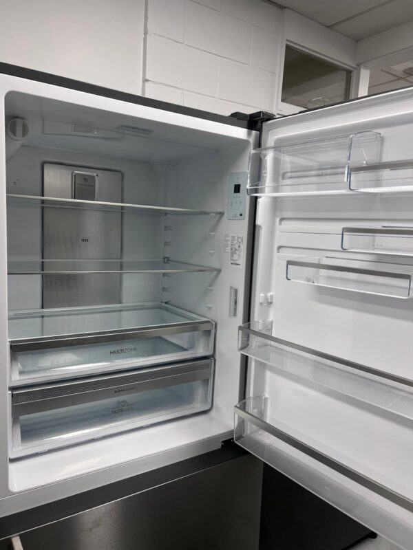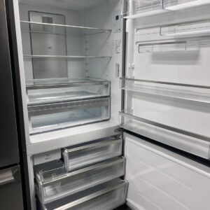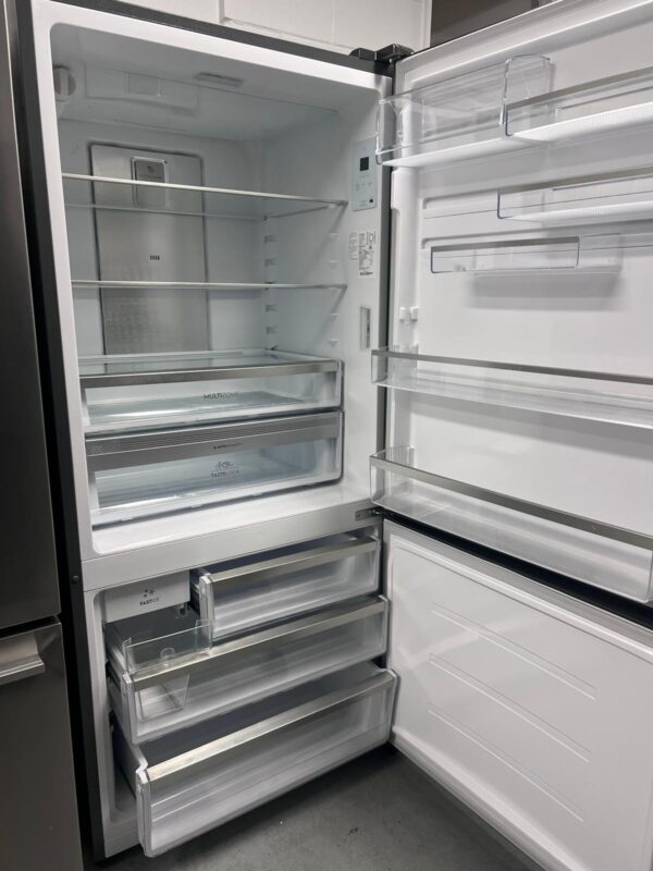 Features: Bottom mount frost-free design, R600a refrigerant, electronic internal touch controls with display, fast ice function, boost mode, fridge and freezer door alarms, deli compartment with telescopic runner, 1 full-width compartment, 1 deep bottle bin, 1 shallow bin