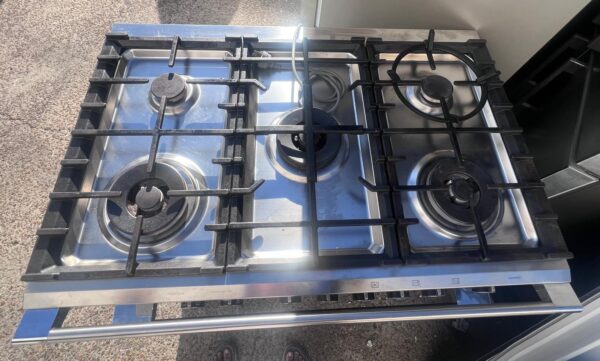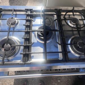 5-burner gas cooktop with sealed range top, dual wok burner (16.2 MJ/h Natural Gas), 2 triple ring wok burners (14.4 MJ/h), semi-rapid burners (6.5 MJ/h), total cooktop power 58 MJ/h. Includes brass burner spreaders and embossed brass burner caps, front controls, LPG/Natural gas compatibility, flame failure safety system, hob rail.