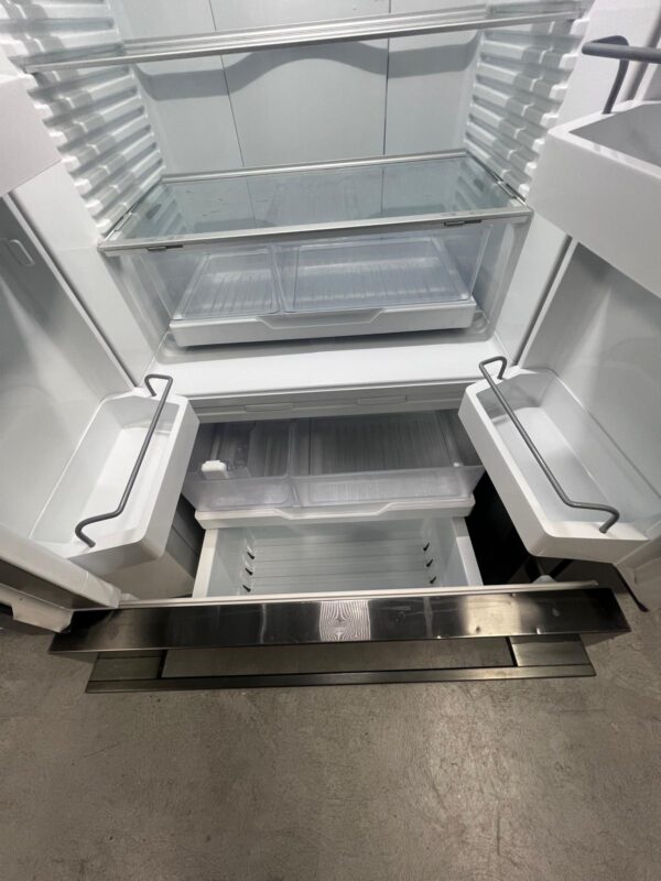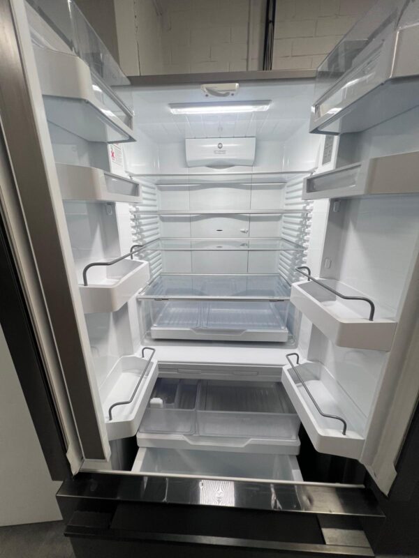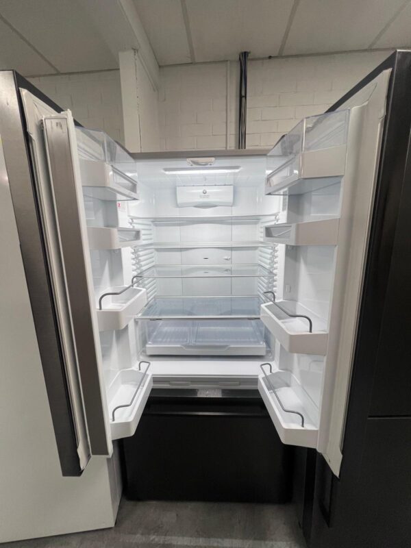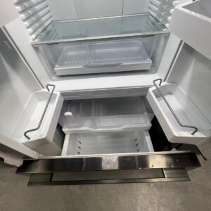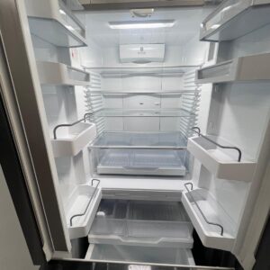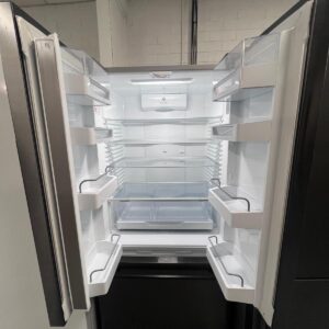 Features: French door frost-free design, ActiveSmart food care, adaptive defrost, inverter-controlled compressor, electronic temperature control, built-in automatic ice maker with ice boost, ultra-slim water dispenser, adjustable glass shelves and door bins, two fruit and vegetable bins, full extension freezer drawers, concealed hinges, door open alarm, LED lighting