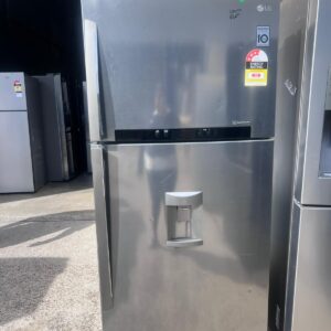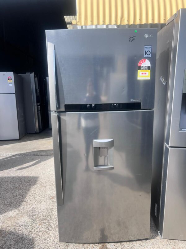 This top mount fridge includes a non-plumbed water dispenser, anti-fingerprint shiny steel finish, and hidden hinges. It features an external water dispenser, door open alarm, BioShield anti-bacterial door seal, and Smart Diagnosis functionality.