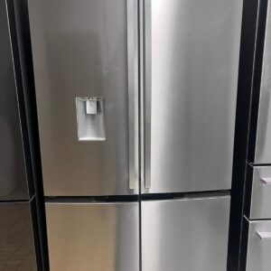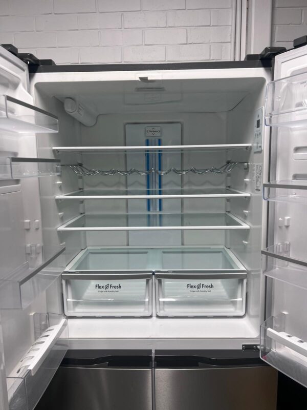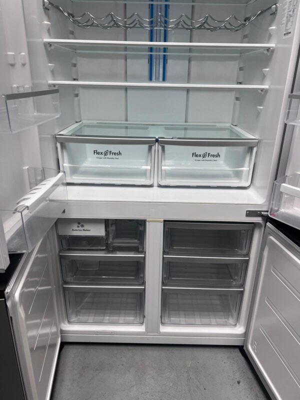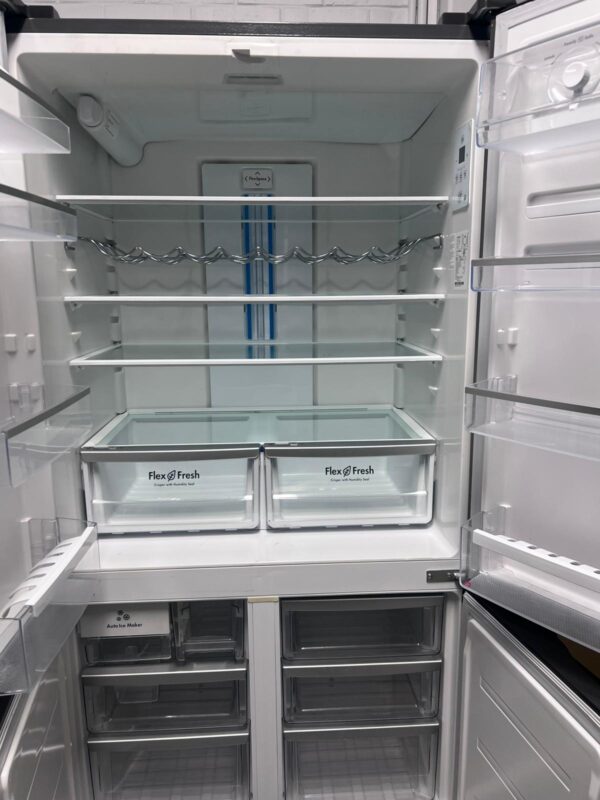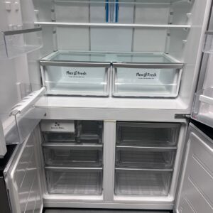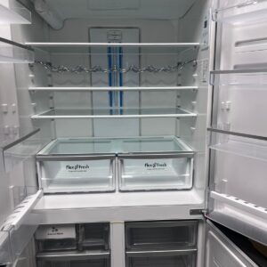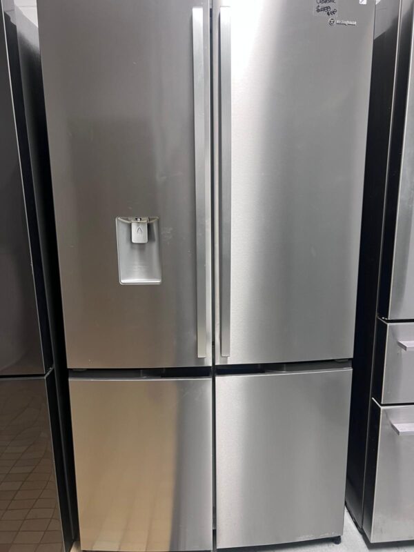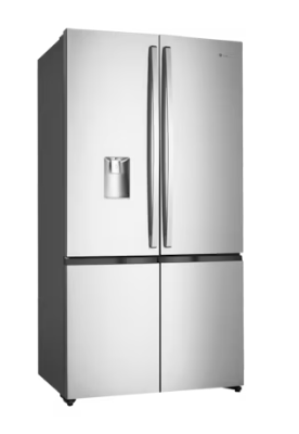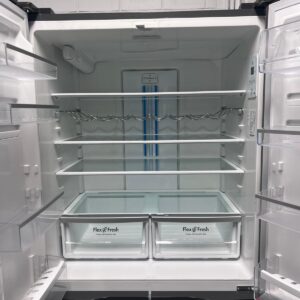 Features: French door design, bar handles, internal electronic touch controls with display, spill-safe adjustable glass shelves, fridge and freezer door alarms, 2 shallow bins and 2 deep bottle bins on fridge door, fridge and freezer doors open left and right, eco mode, shopping mode, holiday mode, quick freeze function, and drink chill alarm